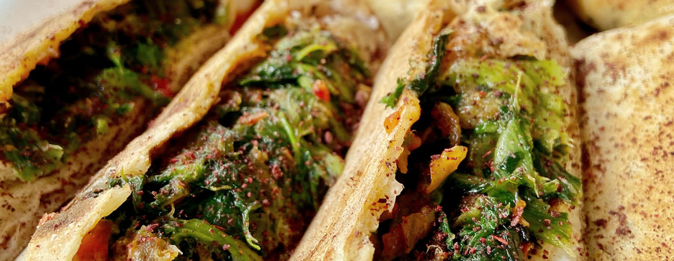 אנחנו לוקחים לנו צלחת של טעימות - מאפה בצק פילו ממולא תרד וגבינות, וגולת הכותרת - לאפה תפוחה עם לאבנה, תבשיל עולש מהביל, סלסה אדומה חריפה וסומאק. הכנת המנה הזו היא אירוע מלבב בפני עצמו, בצק לח וגמיש במרקם של עננים שנאפה בתנור מסוע ומוגש לוהט, נדיב ומפנק. פה אין ״ביס אחד והבנתי את הקטע״, עד שלא תוקעת את כל העטיפה המנחמת הזאת ותכולתה השווה, לא אומרת דיינו.